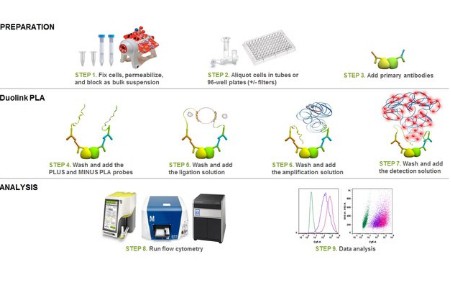 Duolink™ flowPLA Detection Kits will enable sensitive detection of proteins, protein-protein interactions, and protein modifications within cell populations by flow cytometry. To perform a Duolink™ flowPLA experiment, you will need fixed, suspended