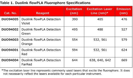 cells, two primary antibodies that specifically recognize your proteins of interest, a pair of PLA probes (one 100RXN PLUS and one 100RXN MINUS), wash buffer, and a Duolink™ flowPLA Detection Kit. The flowPLA Kits are available with 5 different