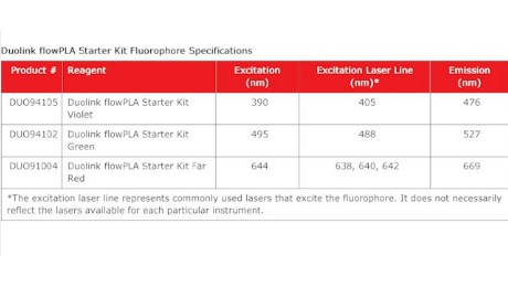 cells, two primary antibodies that specifically recognize your proteins of interest and the Duolink™ flowPLA starter Kit. The flowPLA Starter Kits are available with 3 different fluorophores: Violet, Green, and FarRed. The flowPLA starter