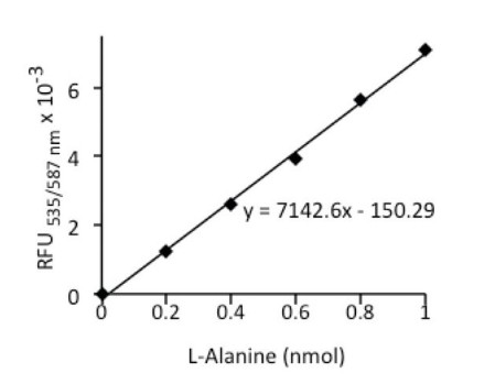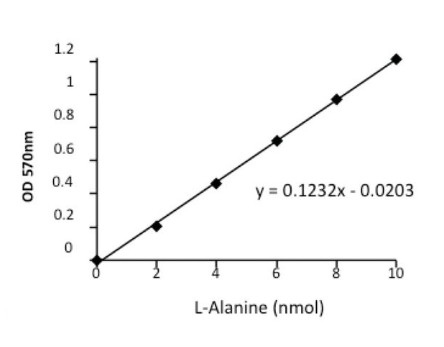 In this kit, alanine concentration is determined by a coupled enzyme assay, which results in a colorimetric (570 nm)/fluorometric (λex = 535/λem = 587 nm) product, proportional to the alanine present. Typical detection ranges for this kit are 2-10 nmole (colorimetric) and 0.2-1 nmole (fluorometric).