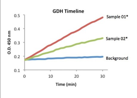 GDH activity is determined by a coupled enzyme assay in which glutamate is consumed by GDH generating NADH, which reacts with a probe generating a colorimetric (450 nm) product proportional to the GDH activity present. One unit of GDH is the amount of enzyme that will generate 1.0 μmole of NADH per minute at pH 7.6 at 37 °C.