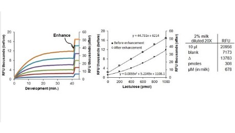 (ranging from 200-1000 pmole/well) in a variety of samples such as food and dairy products. Lactulose concentration is determined by a coupled enzyme assay, which results in a fluorometric (λex = 535/λem = 587 nm) product proportional