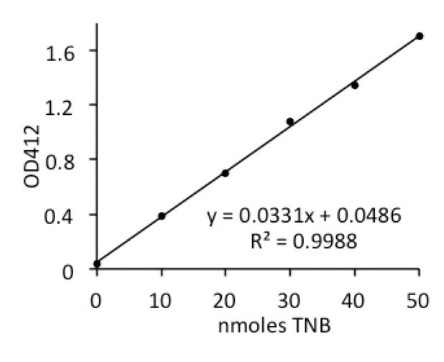 The Lipase Activity Assay kit provides a simple and direct procedure for measuring lipase activity in a variety of samples. Lipase activity is determined using a coupled enzyme reaction, which results in a colorimetric (412 nm) product proportional to the enzymatic activity present. One unit of Lipase is the amount of enzyme that will generate 1.0 μmole of TNB per minute at 37 °C.