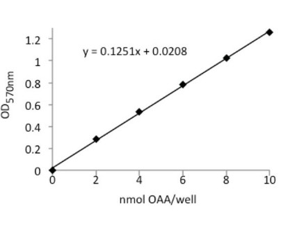 In this kit, oxaloacetate concentration is determined by a coupled enzyme assay, which results in a colorimetric (570 nm)/fluorometric (lex = 535/lem = 587 nm) product, proportional to the oxaloacetate present. Typical detection ranges for this kit are 2–10 nmole (colorimetric) and 0.2–1 nmole (fluorometric).