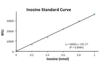 The Inosine Assay Kit provides a simple and direct procedure for measuring inosine in a variety of samples. Inosine concentration is determined by a coupled enzyme reaction in which inosine is converted to hypoxanthine which reacts with the substrate mix and probe, resulting in a fluorometric product (λex = 535/λem = 587 nm), proportional to the inosine present.
