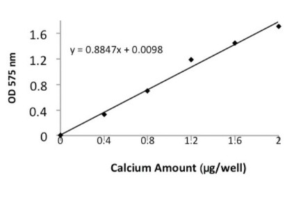 In this assay, the calcium ion concentration is determined by the chromogenic complex formed between calcium ions and o-cresolphthalein, which is measured at 575 nm and is proportional to the concentration of calcium ions present. The linear range of detection for this kit is between 0.4-2.0 μg.
