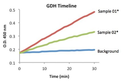 GDH activity is determined by a coupled enzyme assay in which glutamate is consumed by GDH generating NADH, which reacts with a probe generating a colorimetric (450 nm) product proportional to the GDH activity present. One unit of GDH is the amount of enzyme that will generate 1.0 μmole of NADH per minute at pH 7.6 at 37 °C.