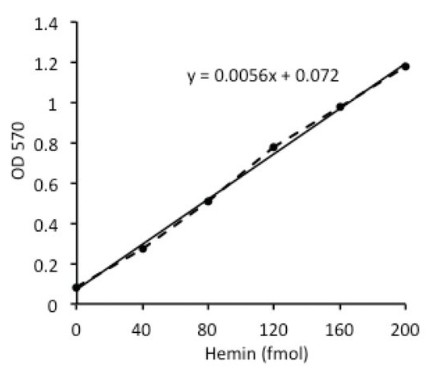 In this assay, Hemin concentration is determined by a coupled enzyme reaction, which results in a colorimetric (570 nm) product, proportional to the Hemin present.