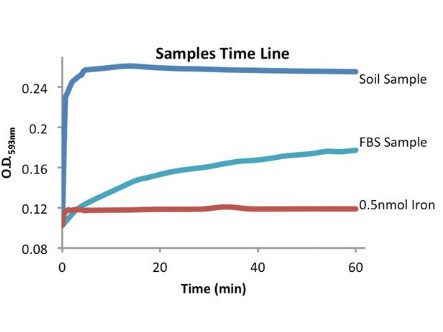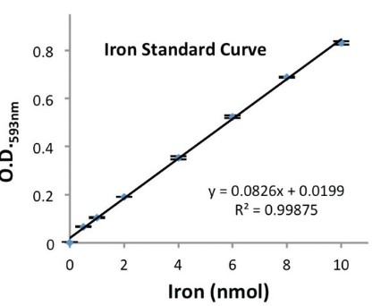 In this assay, iron is released by the addition of an acidic buffer. Samples may be tested directly to measure Fe2+ or reduced to measure total iron (Fe2+ and Fe3+). Released iron is reacted with a chromagen resulting in a colorimetric (593 nm) product, proportional to the iron present. The Iron Assay Kit provides a simple convenient means of measuring iron in a variety of biological samples.