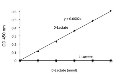 In this assay, D-Lactate is specifically oxidized by D-Lactate hydrogenase and generates a proportional colorimetric product measured at 450 nm. The useful concentration range in samples is 0.1-10 mM D-Lactate.
