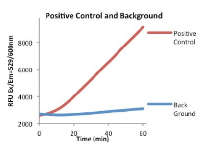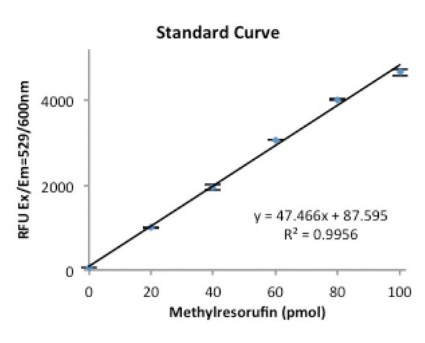 The Lipase Activity Assay Kit III provides a simple and direct procedure for measuring lipase activity in a variety of samples. Lipase activity is determined using a coupled enzyme reaction, which results in the generation of methylresorufin (λex = 529/λem = 600 nm) proportional to the enzymatic activity present. One unit of lipase is the amount of enzyme that will generate 1.0 μmole of methylresorufin from the substrate per minute at 37 °C.