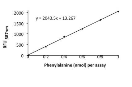 Phenylalanine concentration is determined by a coupled enzyme assay, which results in the deamination of phenylalanine and the production of NADH which reacts with the probe resulting in a fluorescent (λex = 535 nm/λem = 587 nm) product, proportional to the phenylalanine present.