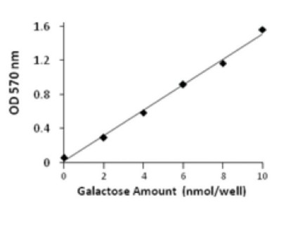 In this assay kit, Galactose is oxidized resulting in a colorimetric (570 nm)/fluorometric (λex = 535 nm/λem = 587 nm) product, proportional to the galactose present. This kit has a linear range of detection between 0.2-1.0 nmole galactose for the fluorometric assay and 2-10 nmole galactose for the colorimetric assay.