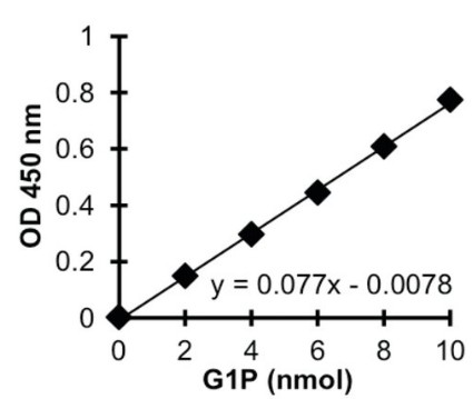 The G1P Colorimetric Assay kit provides a simple and direct procedure for measuring G1P in a variety of samples. G1P concentration is determined by a coupled enzyme assay, in which G1P is converted to glucose-6-phosphate by phosphoglucomutase in the presence of glucose-1,6-biphosphate. The glucose-6-phosphate is oxidized by glucose-6-phosphate dehydrogenase to form NADH. The resulting NADH reduces a colorless probe resulting in a colorimetric (450 nm) product proportional to the G1P present.