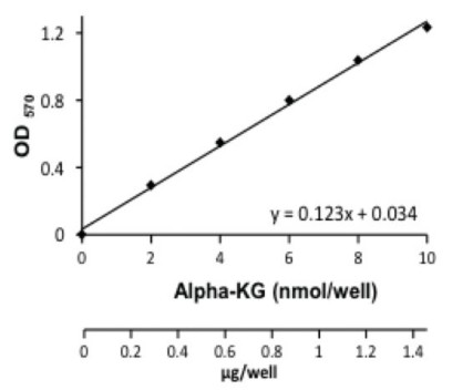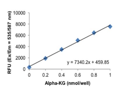 α-KG concentration is determined by a coupled enzyme assay, which results in a colorimetric (570 nm)/ fluorometric (λex = 535/λem = 587 nm) product, proportional to the α-KG present. Typical sensitivities of detection for this kit are 0.01 to 10 nmoles.