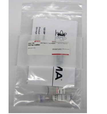 Sigma’s 123 bp DNA Step Ladder contains 35 dsDNA fragments from 123 to 4,182 bp. The fragments are 1 - 34 repeats of a 123 bp region of the rat prolactin gene. Ten ul of the marker should be diluted in gel loading buffer and then loaded in a single lane on an agarose or polyacrylamide gel.
