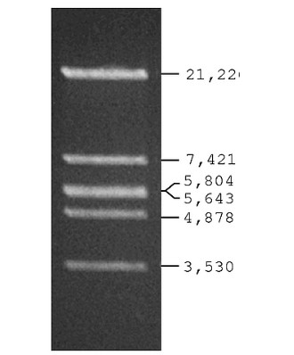 Sigma’s Lambda DNA EcoR I Digest contains 6 fragments from 3,530 – 21,226 bp. Ten ul of the ladder should be diluted in gel loading buffer and then loaded in a single lane on an agarose or polyacrylamide gel.