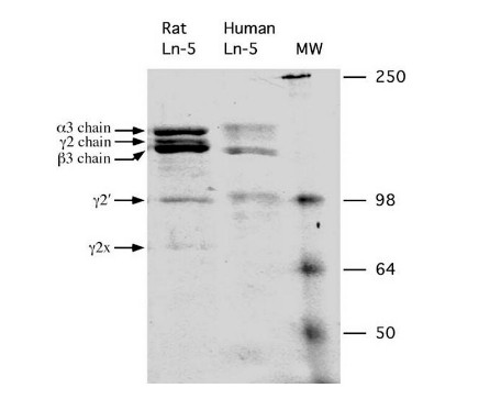 The structural and functional properties of Laminin-5 are well conserved across species. For instance, human cells adhere equally well to human and rat laminin-5. For most purposes, human and rat Laminin-5 are interchangeable, likely based on