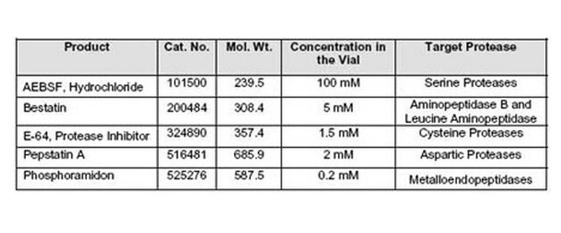 A cocktail of five protease inhibitors with broad specificity for the inhibition of cysteine, serine, aspartic, and thermolysin-like proteases and aminopeptidases. This cocktail is recommended for purification of proteins containing His•Tag® sequences. Each vial contains 100 mM AEBSF, HCl (Cat. No. 101500), 5 mM Bestatin (Cat. No. 200484), 1.5 mM E-64 (Cat. No. 324890), 2 mM Pepstatin A (Cat. No. 516481), and 200 µM of Phosphoramidon, Disodium Salt (Cat. No. 525276). One ml is recommended