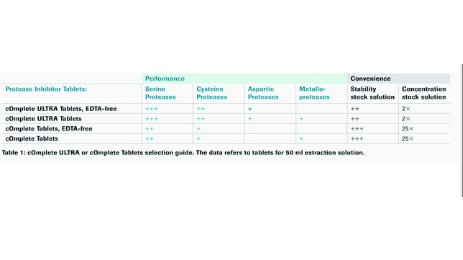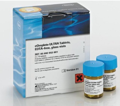 cOmplete ULTRA Tablets, EDTA-free contain the most powerful protease inhibitor cocktail for the optimal protection of your proteins against protease degradation. One cOmplete ULTRA Tablet, EDTA-free is sufficient for a volume of 50 ml extraction solution.