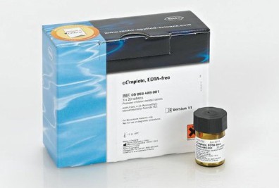 cOmplete, EDTA-free Protease Inhibitor Tablets, inhibit a broad spectrum of serine and cysteine proteases. In contrast to other cOmplete tablets they do not contain EDTA, leaving the stability and the function of metal-dependant proteins unaffected. The