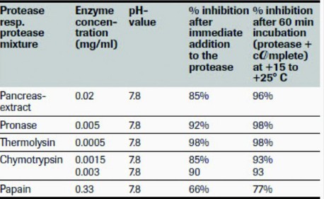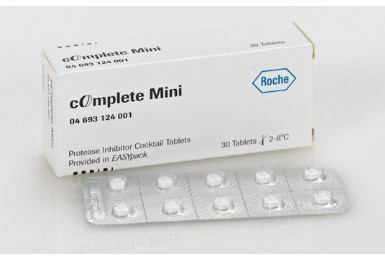 cOmplete, Mini Protease Inhibitor Tablets, inhibit a broad spectrum of serine, cysteine and metalloproteases, as well as calpains. Due to the optimized composition of the tablets, they show excellent inhibition effects, and are well suited for the protection