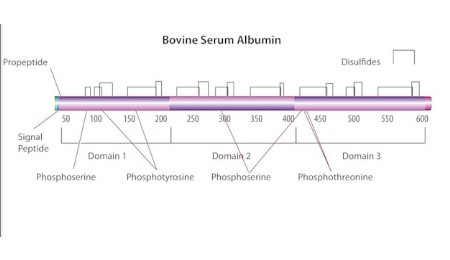 Bovine serum albumin is a protein whose key biological function is to regulate the colloidal osmotic pressure of blood. BSA is widely used in various studies and applications. Made up of 583 amino acids,[2][3] BSA is a water-soluble protein with a calculated molecular weight of 66,430 Da. Six α-helices form three homologous domains of BSA. Depending on pH, it undergoes reversible conformational isomerization. The native structure of the protein becomes reactive and flexible on heating.[4]